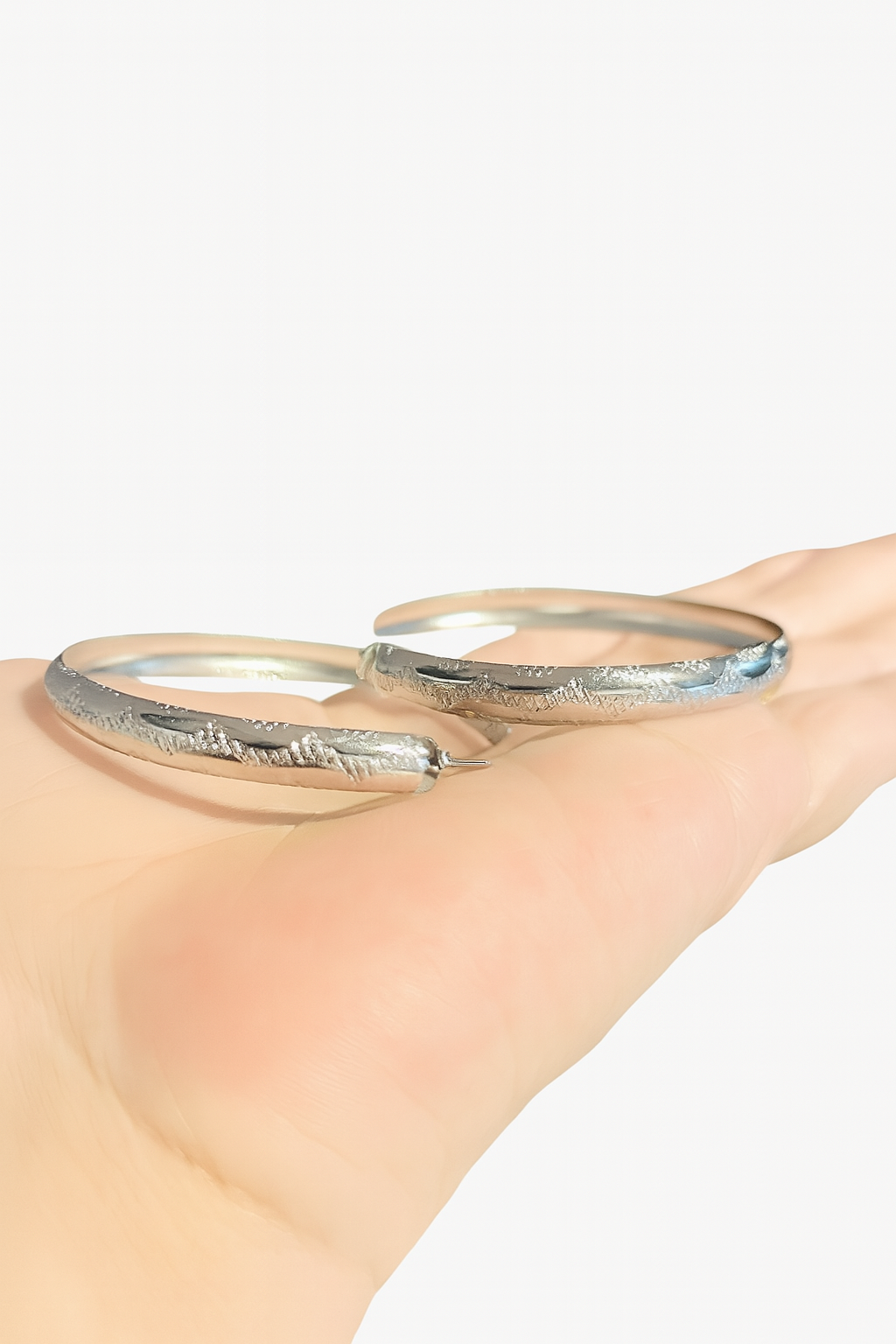 Argola de aço inox hipoalergênico, com detalhes, com aro redondo grosso e fechamento por tarraxas.