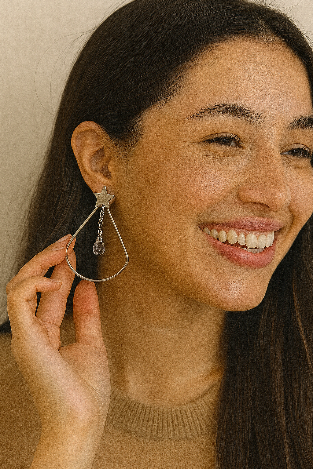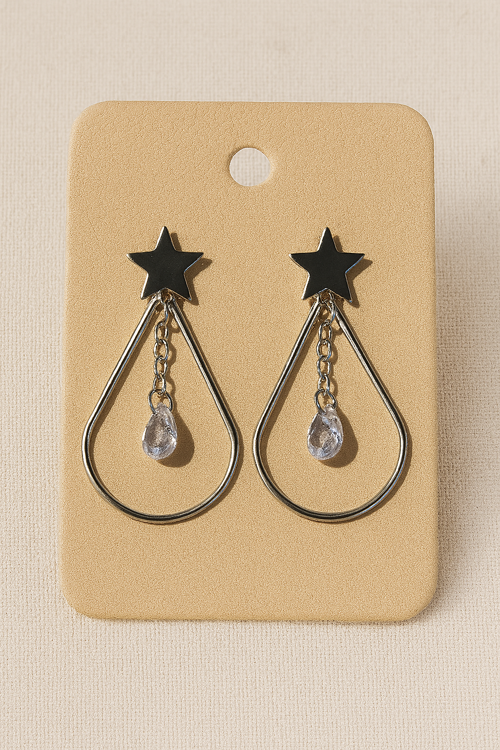 Brinco de aço inox hipoalergênico com gota vazada, uma estrela e uma zircônia transparente.