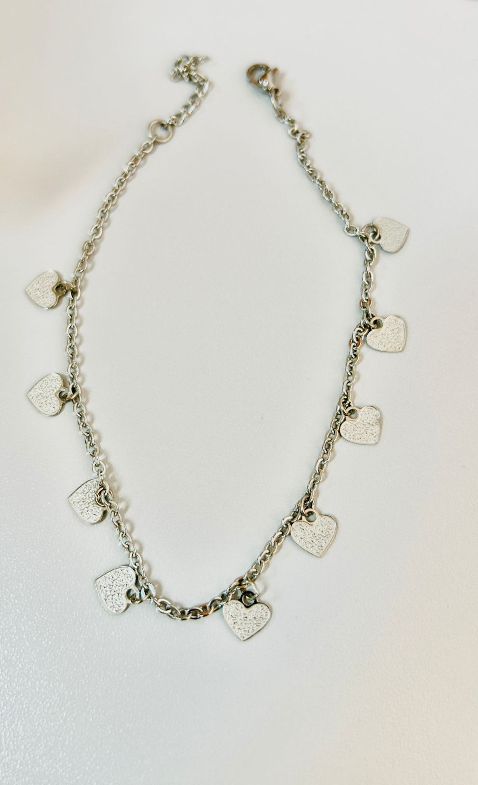 Tornozeleira de aço inox, 9 mini Corações com brilho 28 cm