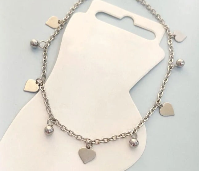 Tornozeleira de aço inox, Corações lisos e Bolinhas 28 cm